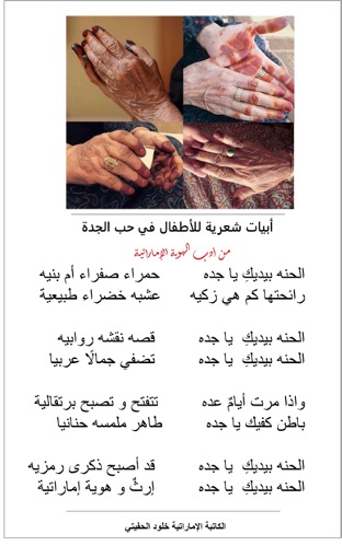 فلنضمن على الأقل هذه التفاصيل الحنونة, اللطيفة ,و ننقل هذه الصورة التخيلية في أبيات شعرية , أغاني و أناشيد لغوية . لنحقق الاستدامة في ما يخص معالم الجدة الإماراتية و ما يميزها من عادات و تقاليد موروثة لنُحي تراثنا في أذهان أجيالنا و نُلهمهم في التغني و المجاهرة اللغوية الأدبية في حب الجدة و الحناء بيدها .